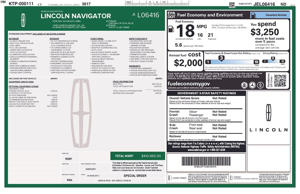 ****SHIPPING AVAILABLE NATIONWIDE! COMPLETE THE ENTIRE TRANSACTION WITHOUT COMING TO THE SHOWROOM!**** O C Welch Ford is pleased to offer this fantastic 2018 Lincoln Navigator Crystal Blue Black Label with the following features: Equipment Group 800A Black Label, GVWR: 7,625 lbs Payload Package, Yacht Club Theme (Floor Carpet/Mats - Blue Bay w/Dinamica Suede, Headliner - Sand Dinamica Suede, Leather-Wrapped Interior - Blue Bay/Alpine, and White Washed Teak Appliques), 1st & 2nd Row All-Weather Floor Liners, 20 Speakers, 3.73 Axle Ratio, 3rd row seats: split-bench, 4-Wheel Disc Brakes, ABS brakes, Adaptive suspension, Adjustable pedals, Air Conditioning, Alloy wheels, AM/FM radio: SiriusXM, AppLink/Apple CarPlay and Android Auto, Audio memory, Auto High-beam Headlights, Auto tilt-away steering wheel, Auto-dimming door mirrors, Auto-dimming Rear-View mirror, Auto-leveling suspension, Automatic temperature control, Bodyside moldings, Brake assist, Bumpers: body-color, Compass, Cruise Control, Delay-off headlights, Driver door bin, Driver vanity mirror, Driver's Seat Mounted Armrest, Dual front impact airbags, Dual front side impact airbags, Electronic Stability Control, Emergency communication system: 911 Assist, Exterior Parking Camera Rear, Four wheel independent suspension, Front anti-roll bar, Front Bucket Seats, Front dual zone A/C, Front fog lights, Front reading lights, Fully automatic headlights, Garage door transmitter: HomeLink, Genuine wood console insert, Genuine wood door panel insert, Heads-Up Display, Heated front seats, Heated door mirrors, Heated rear seats, Heated steering wheel, HVAC memory, Illuminated entry, Leather steering wheel, Lincoln Play, Low tire pressure warning, Memory seat, Navigation System, Occupant sensing airbag, Outside temperature display, Overhead airbag, Overhead console, Panic alarm, Passenger door bin, Passenger seat mounted armrest, Passenger vanity mirror, Pedal memory, Perfect Position Seating w/Active Motion, Power door mirrors, Power driver seat, Power Liftgate, Power moonroof: Panoramic Vista Roof, Power passenger seat, Power steering, Power windows, Radio data system, Radio: Revel Ultima AM/FM/HD/MP3 Audio System, Rain sensing wipers, Rear air conditioning, Rear anti-roll bar, Rear audio controls, Rear reading lights, Rear window defroster, Rear window wiper, Reclining 3rd row seat, Remote CD player, Remote keyless entry, Roof rack: rails only, Security system, SiriusXM Radio, Speed-sensing steering, Speed-Sensitive Wipers, Split folding rear seat, Spoiler, Steering wheel memory, Steering wheel mounted audio controls, SYNC 3 Communications & Entertainment System, Tachometer, Telescoping steering wheel, Tilt steering wheel, Traction control, Trip computer, Turn signal indicator mirrors, Variably intermittent wipers, Venetian Lthr Htd/Cooled Captain's Chair Seat (B), Ventilated front seats, Wheels: 22" 21 Spoke Black Label Ultra-Bright, and Wheels: 22" 6-Spoke Ultra-Bright Machined-Aluminum.