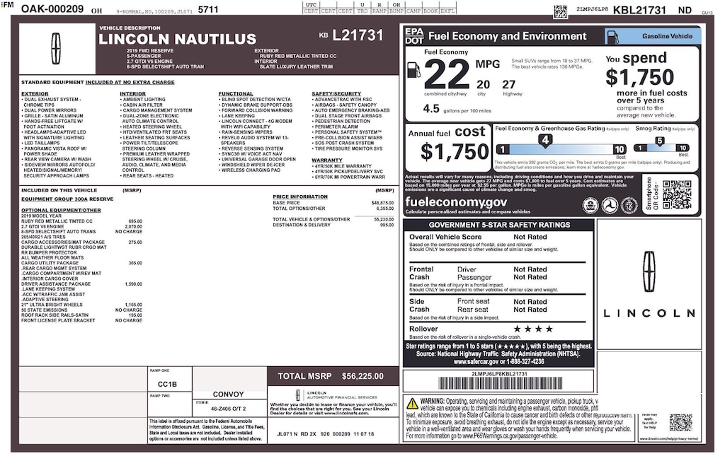 ****SHIPPING AVAILABLE NATIONWIDE! COMPLETE THE ENTIRE TRANSACTION WITHOUT COMING TO THE SHOWROOM!**** O C Welch Ford is pleased to offer this great 2019 Lincoln Nautilus Ruby Red Metallic Reserve with the following features: Cargo Accessories and Mat Package (All-Weather Floor Liners, Durable Lightweight Rubber Cargo Mat, and Rear Bumper Anti-Scratch Pad/Load Protector), Cargo Utility Package (110V/150W AC Power Outlet, Cargo Compartment w/Reversible Mat, Interior Cargo Cover, Molded Plastic Storage Bins, and Rear Cargo Management System), Driver Assistance Package (Adaptive Cruise Control, Adaptive Steering, and Collision Mitigation System), Equipment Group 300A, 13 Speakers, 3.80 Axle Ratio, 4-Wheel Disc Brakes, ABS brakes, Adaptive suspension, Air Conditioning, Alloy wheels, AM/FM radio: SiriusXM, AppLink/Apple CarPlay and Android Auto, Auto High-beam Headlights, Auto tilt-away steering wheel, Auto-dimming door mirrors, Auto-dimming Rear-View mirror, Automatic temperature control, Brake assist, Bumpers: body-color, CD player, Compass, Cruise Control, Delay-off headlights, Driver door bin, Driver vanity mirror, Dual front impact airbags, Dual front side impact airbags, Electronic Stability Control, Emergency communication system: 911 Assist, Exterior Parking Camera Rear, Four wheel independent suspension, Front anti-roll bar, Front Bucket Seats, Front Center Armrest w/Storage, Front dual zone A/C, Front fog lights, Front reading lights, Fully automatic headlights, Garage door transmitter: HomeLink, Genuine wood console insert, Genuine wood door panel insert, Heated front seats, Heated door mirrors, Heated rear seats, Heated steering wheel, Illuminated entry, Knee airbag, Leather steering wheel, Low tire pressure warning, Memory seat, Navigation System, Occupant sensing airbag, Outside temperature display, Overhead airbag, Overhead console, Panic alarm, Passenger door bin, Passenger vanity mirror, Power door mirrors, Power driver seat, Power Liftgate, Power moonroof: Panoramic Vista Roof, Power passenger seat, Power steering, Power windows, Prem Lthr-Trimmed Heated/Cooled Bucket Seats, Radio data system, Radio: Revel Audio w/Single-CD, HD & Nav, Rain sensing wipers, Rear anti-roll bar, Rear reading lights, Rear seat center armrest, Rear window defroster, Rear window wiper, Remote keyless entry, Satin Roof Rack Side Rails w/o Crossbars, Security system, Speed-sensing steering, Speed-Sensitive Wipers, Split folding rear seat, Spoiler, Steering wheel memory, Steering wheel mounted A/C controls, Steering wheel mounted audio controls, SYNC 3 Communications & Entertainment System, Tachometer, Telescoping steering wheel, Tilt steering wheel, Traction control, Trip computer, Turn signal indicator mirrors, Variably intermittent wipers, Ventilated front seats, Voice-Activated Touchscreen Navigation System, Wheels: 20" Prem Painted Bright Machined Alum, and Wheels: 21" Premium Painted Ultra Bright Mach Alum.