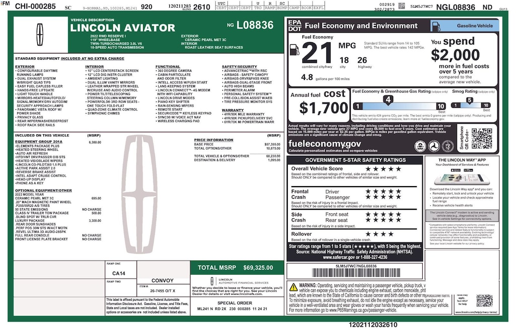 ****SHIPPING AVAILABLE NATIONWIDE! FREE SHIPPING AVAILABLE UP TO 300 MILES! COMPLETE THE ENTIRE TRANSACTION WITHOUT COMING TO THE SHOWROOM!**** O C Welch is proud to present you with another True Market Priced Pre-Owned Vehicle. This 2022 Lincoln Aviator Reserve is loaded with the following Factory Options:Class IV Trailer Tow Package (4-Pin & 7-Pin Connectors, Blind Spot Information System, Class IV Hitch & Wiring, Smart Trailer Tow, and Trailer Sway Control), Elements Package Plus (Auto Air Refresh, Auto Heated/Ventilated Driver & Passenger Seats, Heated Steering Wheel, Heated VisioBlade Wipers, and Heated/Ventilated 2nd Row Outboard Seats), Equipment Group 201A (Head-Up Display and Phone As A Key), Lincoln Co-Pilot360 1.5 Plus (Active Park Assist 2.0, Evasive Steering Assist, Intelligent Adaptive Cruise Control, and Reverse Brake Assist), Luxury Package (30-Way Perfect Position Seats w/Active Motion, Radio: Revel Ultima 3D Audio System w/28 Speakers, and Rear Door Sunshades), 14 Speakers, 3.58 Axle Ratio, 3rd row seats: split-bench, 4-Wheel Disc Brakes, ABS brakes, Air Conditioning, Alloy wheels, AM/FM radio: SiriusXM, Audio memory, Auto High-beam Headlights, Auto-dimming door mirrors, Auto-dimming Rear-View mirror, Automatic temperature control, Brake assist, Bumpers: body-color, Compass, Cruise Control, Delay-off headlights, Driver door bin, Driver vanity mirror, Dual front impact airbags, Dual front side impact airbags, Electronic Stability Control, Emergency communication system, Four wheel independent suspension, Front anti-roll bar, Front Bucket Seats, Front Center Armrest, Front dual zone A/C, Front fog lights, Front License Plate Bracket, Front reading lights, Full Rear Console, Fully automatic headlights, Garage door transmitter, Heated front seats, Heated door mirrors, HVAC memory, Illuminated entry, Knee airbag, Leather steering wheel, Low tire pressure warning, Memory seat, Navigation System, Occupant sensing airbag, Outside temperature display, Overhead airbag, Overhead console, Panic alarm, Passenger door bin, Passenger vanity mirror, Power door mirrors, Power driver seat, Power Liftgate, Power moonroof: Panoramic Vista Roof, Power passenger seat, Power steering, Power windows, Premium Lthr Heated/Ventilated Fnt Captain's Chairs, Radio data system, Radio: Revel AM/FM Audio System w/14 Speakers, Rain sensing wipers, Rear air conditioning, Rear anti-roll bar, Rear audio controls, Rear dual zone A/C, Rear reading lights, Rear window defroster, Rear window wiper, Remote keyless entry, Security system, SiriusXM Radio, Speed-Sensitive Wipers, Split folding rear seat, Spoiler, Steering wheel memory, Steering wheel mounted A/C controls, Steering wheel mounted audio controls, SYNC 3 Communication & Entertainment System, Tachometer, Telescoping steering wheel, Tilt steering wheel, Traction control, Trip computer, Turn signal indicator mirrors, Variably intermittent wipers, and Wheels: 20" Bright-Machined Aluminum Please call us Today at 843-288-0220. Thank you very much!
